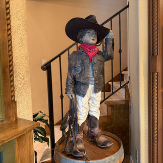 This piece depicts a 4-year-old not quite ready to be a rodeo contestant. The Little Britches Rodeo was founded in 1952 and gives children ages 5 to 18 the opportunity to compete in various rodeo events. This sculpture is life sized plaster cast finished in iron and mounted on a revolving base. Little Britches was exhibited in Santa Fe at Art Santa Fe July 22-14, 2024. Little Britches is available to purchase with base.